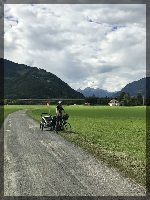 Nun kann es losgehen. Irgendwie ist es fast so wie in einer Münchner S-Bahn, zumal auch hier ein Großteil der Strecke unterirdisch verläuft. Nur sind hier - zumindest in unserem Waggon - fast ausschließlich Fahrradfahrer unterwegs. Wie wir beim Aussteigen am Bahnhof Mallnitz feststellen, sind Radler ohne elektrische Unterstützung eine absolute Minderheit. Sehr erstaunlich, wie schnell und stark sich die E-Bikes in den letzten Jahren durchgesetzt haben. Wir kommen fast als letztes weg, schließlich muss der Anhänger wieder ausgeladen und fahrtauglich gemacht werden. Nach einem kleinen Stück bergab und einem kurzen Gegenanstieg folgt eine rasante Abfahrt ins Tal der Möll. Wir bremsen ein wenig mehr als eigentlich notwendig wäre, schließlich hat Dirk ein Kind im Anhänger und Katharina eines im Bauch - da muss man nicht mehr riskieren, als notwendig. Dennoch macht die Abfahrt richtig Spaß und recht bald erreichen wir Dürnvellach.