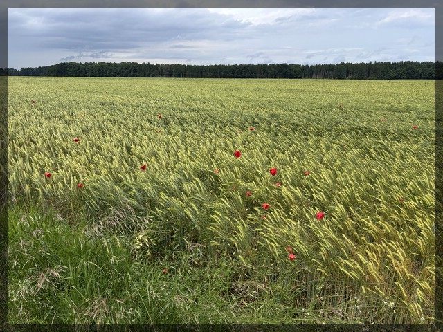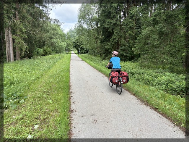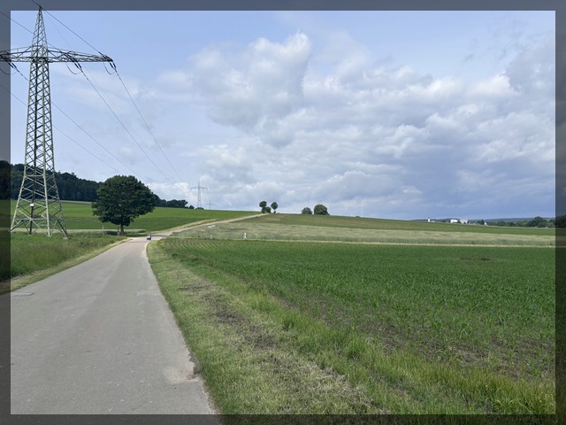 Hinter Zusmarshausen überqueren wir die Autobahn A8. Danach kommt ein Anstieg, der mit Kinderanhänger einiges an Körnern kostet. Auf der Fahrt nach Bordeaux wollten wir dieses Stück umfahren und sind dabei auf abenteuerliche Waldwege geraten, welche wir heute – mit dem Kinderanhänger hinten dran – nicht mal ansatzweise in Betracht gezogen haben. Als es flacher wird – auf beiden Seiten der Straße befindet sich dichter Wald - öffnet der Himmel seine Schleusen so richtig. Wir werden komplett nass und der schöne Barfußpark in Glöttweng – hier wollten wir eine Pause einlegen – wir nur kurz im Vorbeifahren angeschaut. Der direkt daneben befindliche hübsche Gasthof hat über Pfingsten wegen Personalmangel geschlossen. Da zudem beide Kinder schlafen, lassen wir jegliche Überlegungen, uns irgendwo etwas abzutrocknen, bleiben und rollen weiter.