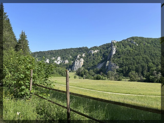 Weiter geht es durch das immer noch enge und von schroffen Felsen umstandene Donautal. Nach nur kurzer Fahr weitet sich das Tal aber etwas auf und der Radweg wird deutlich weniger wellig. Statt größtenteils auf Schotter wie gestern sind wir nun über weite Strecken auf einem perfekten Asphaltband unterwegs. Wir kommen an einer der berühmten Donauversickerungen vorbei, wo die Donau fast komplett im Boden versickert. Das meiste Wasser taucht nach einiger Zeit wieder auf als wäre nichts geschehen und fließt weiter in Richtung Schwarzes Meer. Ein kleiner Teil aber fließt unterirdisch in Richtung Bodensee, endet also im Rhein und letztendlich in der Nordsee. Da wir gut vorankommen, haben wir viel Zeit für Spielplatzpausen, die erste davon in Tuttlingen. In dieser Ortschaft bleiben wir nördlich der Donau und kommen daher nicht in die eigentliche Innenstadt. Im Donaupark, einer schönen Grünanlage, gibt es neben einer großen Skatebahn einen hübschen großen Spielplatz, inklusive Sonnensegeln. Franziska traut sich sogar, dreimal gemeinsam mit Alex die große Rutsche zu rutschen.