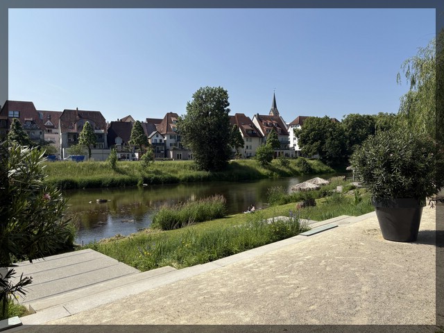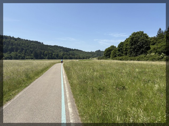 Nach der Pause geht es weiter entlang der Donau und vorbei am übervollen Freibad von Tuttlingen. Das hübsche Möhringen wird vom Donauradweg im wilden Zick-Zack durchquert und danach kommen wir zu noch einer Donauversickerung. In Geisingen, es ist inzwischen richtig heiß, legen wir an einem Supermarkt eine Pause zum Eisessen ein und verbringen danach eine Stunde auf einem kleinen aber hübschen Spielplatz in einem Neubaugebiet. Kurz hinter Geisingen öffnet sich das Donautal komplett und wir sind in einer weiten Hügellandschaft unterwegs. In Pfohren müssen wir ein kurzes Stück einer Umleitung folgen und nun ist es nicht mehr weit bis nach Donaueschingen.