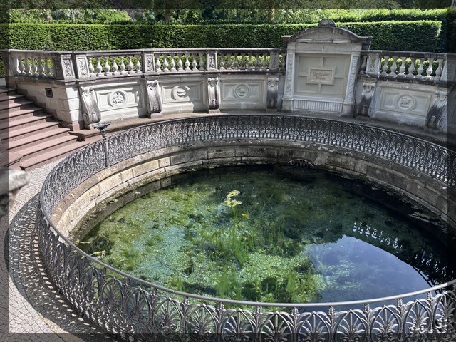 Das allerletzte Stück Donauradweg, schon in Donaueschingen, führt durch einen gepflegten Park. Hier legen wir zuerst einen ganz kurzen Abstecher zum Donauursprung ein, wo die beiden Flüsse Breg und Brigach zusammenfließen. In Richtung der Innenstadt fahren wir weiter durch den Park, dann biegen wir nach rechts ab und sind da: vor dem Bräustüble der Fürstenbergischen Brauerei steht das Startschild vom Donauradweg und ein paar Meter weiter führen ein paar Treppenstufen bergab zur Donauquelle, wo angeblich auch die Donau entsteht: eine Art kreisrund eingefasster Brunnen. Sehr gut gefällt uns hier das am oberen Ende der Treppen angebrachte moderne Relief, welches den gesamten Verlauf der Donau bis zum Schwarzen Meer zeigt. Wir schauen uns das Ganze ausführlich an und fahren dann weiter zum Hotel.