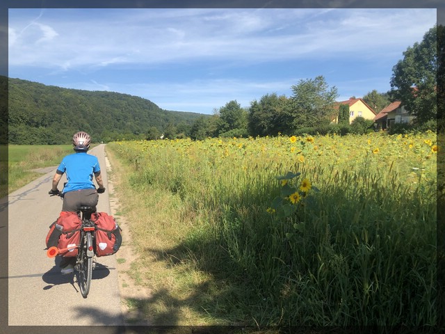 Heute ist wieder ein sehr heißer Sommertag. Wir frühstücken so früh wie möglich und sind sehr froh, dass die nette Wirtin vom Hotel für uns alles 15 Minuten früher vorbereitet hat, als eigentlich üblich. Unsere Route verläuft noch einige Kilometer entlang der Donau in Richtung Regensburg. Hier sind wir auch auf unserer allerersten langen Tour unterwegs gewesen, als wir nach Breslau und Krakau gefahren sind. Damals waren wir aber nur zu zweit, jetzt sind wir zu viert. Auf den ersten Kilometern meldet Franzi wieder an, dass sie nicht perfekt glücklich ist. Und das, nachdem gestern alles so gut war. Leider kann sie uns noch nicht genau erklären, woran es hakt. Eine ausgedehnte Pause mit Kuscheln und gemeinsam Breze essen macht aber wieder alles gut. Mal schauen, wie sich das weiterentwickelt. Im Fall der Fälle müssten wir irgendwo auf den Zug oder ein Mietauto umsteigen oder ganz abbrechen.
