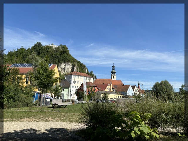 Erstmal geht es aber mit dem Rad weiter und zwar verlassen wir beim Regensburger Vorort Prüfening den Donau-Radweg. Es geht recht steil (zumindest kommt das demjenigen vor uns so vor, der einen Anhänger mit zwei Kindern hinter sich herzieht) nach oben und dann überqueren wir die Donau über eine Eisenbahnbrücke. Interessanterweise kommt eine zweite Brückenüberquerung direkt hintendran: Auf der anderen Seite der Donau geht es wieder recht steil bergab und dann überqueren wir die Naab kurz vor deren Mündung in die Donau. Bis Etterzhausen fahren wir auf einem straßenbegleitenden Radweg aber im weiteren Verlauf – nun größtenteils weit entfernt von jeglichen Straßen – wird der Naabtalradweg wirklich schön: der Belag wechselt munter zwischen Asphalt und Schotter und wir fahren etwas hügelig durch schöne Landschaften, oft auch durch Wald. Letzteres finden wir gerade aufgrund des aktuellen Wetters sehr praktisch. Die Strecke wird aufgelockert durch schöne Ortsdurchfahren. In Erinnerung geblieben ist uns neben zahlreichen von den Hügeln herunterlugenden Burgen vor allem Pielenhofen mit dem auf der anderen Flussseite befindlichen Kloster.