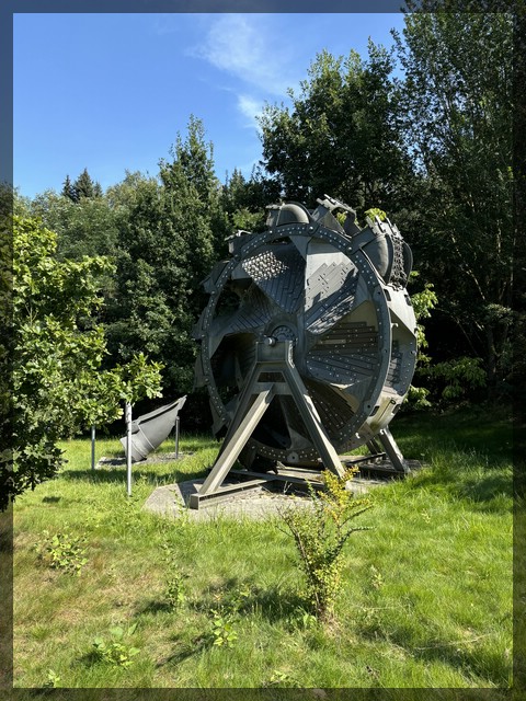Nachdem sämtliche Übernachtungsmöglichkeiten direkt am See entweder ausgebucht oder unbezahlbar teuer waren, rollen wir weiter durch eine hübsche Waldlandschaft ins nahe gelegene Wackersdorf. Der Name dieser Ortschaft dürfte jedem etwas sagen, der die 80er-Jahre schon bewusst wahrgenommen hat: in einem Versuch, die nach dem Ende des Kohlebergbaus strukturschwache Region zu unterstützen, sollte hier eine Wiederaufbereitungsanlage für atomare Brennstäbe errichtet werden. Etliche Protestaktionen und Demonstrationen später wurde dieser Plan wieder fallen gelassen, letztendlich vermutlich zum Vorteil der Region. Kurz vor Wackersdorf kommen wir an ein paar zu einer Ausstellung drapierten Ansammlung von alten Bergbauwerkzeugen vorbei und ziehen dann den Anhänger durch die Hitze bergauf in Richtung der leicht gesichtslosen Innenstadt, welche wir eine ausgedehnte Eis-Pause an einem Supermarkt später schließlich auch erreichen. Das vorgebuchte Hotel ist sehr nett und die Begrüßung freundlich, darum bleiben wir zum Abendessen gleich dort.