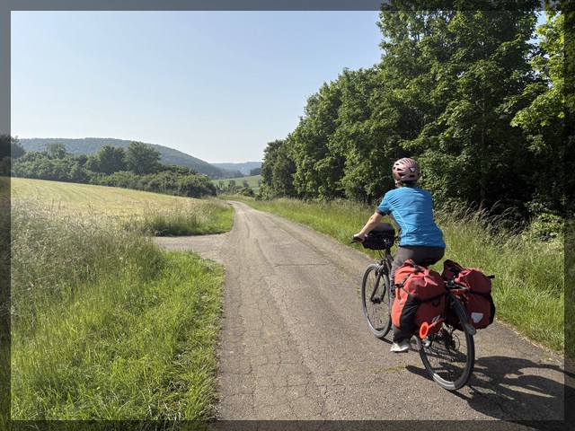 Heute ist der Himmel wieder wolkenlos und es soll ziemlich warm werden. Nachdem wir uns gestern den Startpunkt vom Donauradweg nur kurz angeschaut haben – Dirk hat das in den Boden eingelassene Höhenprofil vom gesamten Donauverlauf gar nicht gesehen - halten wir dort nochmal an und wir machen auch nochmal einen Abstecher zum Donauursprung, an dem wir gestern recht schnell wieder weiter gefahren sind. Danach aber verlassen wir aber die Donau endgültig und rollen Richtung Süden aus Donaueschingen heraus, zuerst durch Allmendshofen und Hüfingen, das sind fast noch Vororte bzw. Ausläufer von Donaueschingen. Ein ganz kurzes Stück fahren wir dabei entlang der Breg und von Anfang an geht es ganz leicht aber stetig bergauf. Wir folgen auf einem straßenbegleitenden Radweg der B27 nach Süden, aber zumeist recht hübsch in einigem Abstand zur großen Straße. Hier geht es nun etwas steiler bergauf. Irgendwie ist das auch logisch, denn wir müssen heute ja eine Wasserscheide überqueren. Hinter der kleinen Ortschaft Behla wird es dann ganz kurz wirklich steil und Dirk kommt sehr ins Schnaufen. Überraschend schnell erreichen wir den höchsten Punkt des Tages. Der Blick zurück in die Ebene ist phänomenal, wir können sogar am Horizont Donaueschingen erahnen.