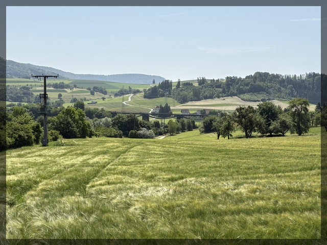Wir fahren eine Weile über eine tolle und nur leicht wellige Ebene. Eine erste rasante Abfahrt führt uns an Riedböhringen vorbei nach Blumberg-Zollhaus. Hier kommt noch ein Gegenanstieg, vorbei an einer uns sehr interessant aussehenden Firma für Schwarzwaldschinken. Es ist wohl Zeit für eine erste Pause mit Brotzeit… Danach müssen wir auf einer Autostraße eine Rampe von 15 % herunterfahren, alternative wäre ein Trampelpfad über eine Wiese und ein mindestens ebenso steiler Schotterweg im Wald. Zum Glück ist nicht viel los und die wenigen Autos passen auf. Auf der Abfahrt bekommen wir auch ein Viadukt der berühmten Sauschwänzlebahn zu Gesicht. Die Bahn führt von Blumberg-Zollhaus nach Süden und wurde 1890 eröffnet. Nach 1870/71 geschah das Ganze als Vorbereitung für weitere mögliche Kriege gegen Frankreich. Da die Bahnlinie für die damaligen Lokomotiven viel zu steil ausgefallen wäre, wird die Strecke mit Hilfe von zahlreichen Viadukten und Kehren, teilweise in Tunneln, künstlich gelängt. Von diesen Strukturen hat die Sauschwänzlebahn auch Ihren Namen. Unten angekommen können wir wieder auf kleinen Radwegen bis in die Ortschaft Fützen rollen, vorbei am dortigen Bahnhof der Sauschwänzlebahn, ganz stilecht inklusive Kohlevorrat und Kohlekran für die Dampflokomotiven. In Fützen soll es einen Kinderspielplatz geben, der sich aber recht gut vor uns versteckt. Als wir den Spielplatz letztendlich doch finden, sind wir überrascht, wie hübsch er ist - das hätten wir in einer so kleinen und abgelegenen Ortschaft nicht erwartet. Wir legen in der Mittagshitze eine längere Pause mit Essen und Trinken ein und fahren dann weiter.