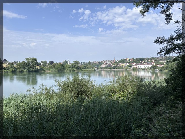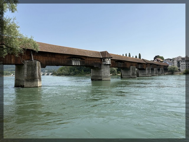 Von der auf dem Rhein-Hochufer gelegenen Innenstadt von Waldshut rollen wir runter zum Fluss, wo wir immer in der Nähe des Flusses daherrollen. Zuerst durch eine schöne Auenlandschaft zwischen dem Rhein selber und einem für ein Wasserkraftwerk angelegten Kanal. Alles sehr hübsch, irgendwie passt da aber das auf der Schweizer Seite stehende Kernspaltungskraftwerk Leibstadt mit seinem heftig dampfenden Kühlturm nicht wirklich dazu. Es kommen immer wieder kleinere Anstiege, jeweils maximal nur 20 bis 25 Meter hoch, aber mit dem Anhänger jedes Mal eine kleine Herausforderung. Von der Ortschaft Laufenburg gibt es eine Version auf der Deutschen Flussseite und eine auf der Schweizerischen. Wir haben zuerst von einem Hochufer aus einen schönen Blick auf die Schweizerische Ortschaft und rollen dann durch die hübsche Altstadt auf der Deutschen Seite. In Murg kommen wir an einem toll aussehenden Freibad vorbei und sind ein wenig neidisch auf die Menschen, die hier relaxen können. Direkt entlang der Eisenbahnlinie erreichen wir das sehr hübsche Bad Säckingen, wo wir uns die alte Holzbrücke über den Rhein anschauen. Mit fast 204 Metern handelt es sich dabei um die längste Gedeckte Holzbrücke Europas. Die Brücke steht wohl seit 1272 hier, wurde aber seitdem mehrfach zerstört und wieder aufgebaut. Dann legen wir eine längere Pause auf einem Spielplatz ein.