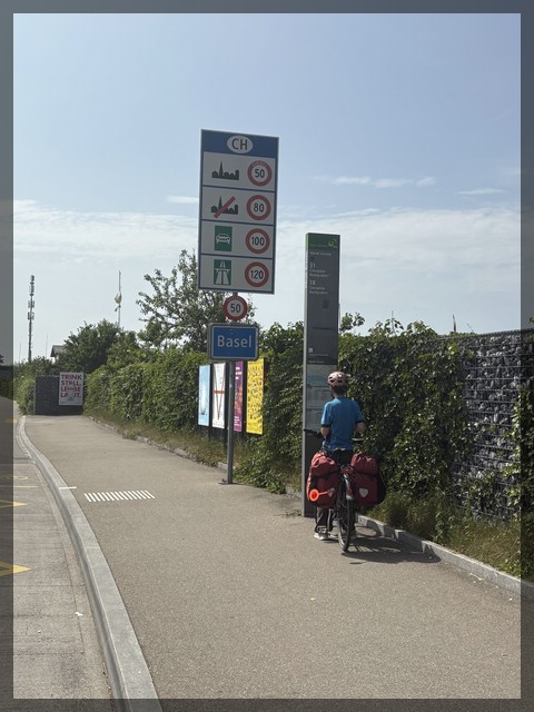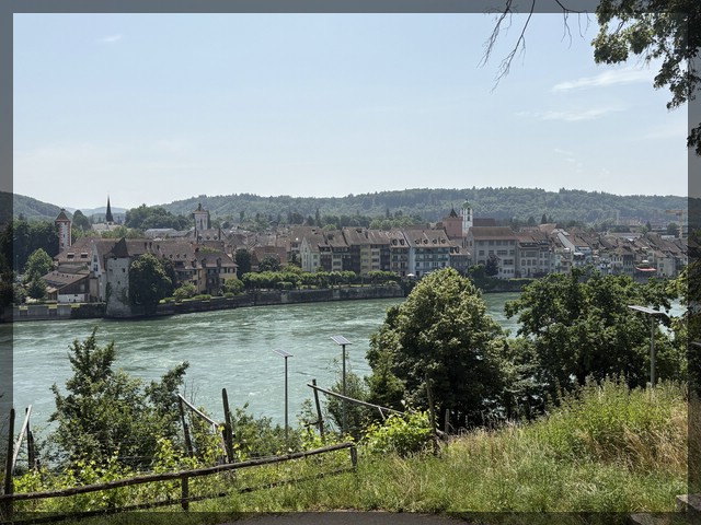 In Wyhlen müssen wir aufgrund einer Straßenbaustelle ein Stück des Radwegs großräumig umfahren und bald darauf erreichen wir Grenzach und den Grenzübergang in die Schweiz. Sehr prominent sind die Hochhäuser der Firma Roche zu sehen. Grenzkontrollen gibt es keine und kurz hinter der Grenze tauscht Dirk an seinem Rad die Flagge von Baden-Württemberg durch diejenige der Schweiz aus - darauf hat Alex sich schon längere Zeit gefreut. Wir fahren entlang einer vielbefahrenen Straße und unsere eigentlich angedachte Route würde weiter entlang dieser Straße verlaufen, aber wir nehmen mehr oder weniger aus Versehen eine deutlich schönere Alternative südlich vom Fluss. Noch einmal etwas bergauf geht es in die schöne Altstadt und weiter zu unserem mitten drin gelegenen Hotel.