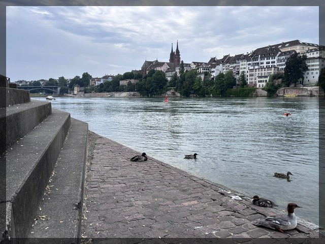 Direkt auf der anderen Seite des Flusses liegt eine der winzigen hölzernen Personenfähren, auf denen man in Basel den Rhein überqueren kann. Dafür ist es aber noch zu früh, also schauen wir uns zuerst den sehr schönen Kreuzgang vom Münster an. Beeindruckend zwei Bronzebildnisse, die einen mit Obst und Gemüse bedeckten Markttisch zeigen sowie einen leeren Tisch mit einer Totenkopfmaske daneben. Das Ganze soll an die Vergänglichkeit von Allem erinnern. Wir verlassen den Kreuzgang, sehen dabei eine der wohl ersten Touristenführungen des Tages, und laufen vorbei am Naturhistorischen Museum und der Martinskirche zum Rhein, den wir über die Mittlere Brücke überqueren. An der Rheinpromenade beobachten wir einige waghalsige Personen, die im Rhein schwimmen sowie eine Gänsesägermutter mitsamt Küken. Wir bewundern das bronzene Stadtmodell und überqueren dann den Rhein mit der kleinen Fähre, die wir vorher schon vom Münster aus gesehen haben. Es ist erstaunlich, wie rasch man mit diesem winzigen Holzding über den Fluss kommt. Zurück am Hotel machen wir uns fertig, checken aus, holen die Räder und den Anhänger aus dem Müllraum und fahren los.