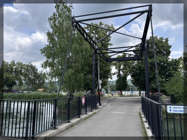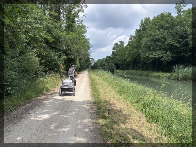 Es ist immer noch recht warm, aber nicht ganz so heiß wie gestern. Laut Wetterbericht soll es heute noch sehr heftig regnen. Wir sind gespannt und fahren los, entlang dem Rheinufer auf einem tollen Radweg nach Norden. Hier kommt überraschend schnell die Grenze nach Frankreich und Dirks Rad bekommt wieder eine neue Flagge verpasst. Bei Huningue, ungefähr auf der Höhe des Dreiländerecks zwischen Frankreich, der Schweiz und Deutschland biegen wir vom Rhein ab und folgen nun dem schnurgerade verlaufenden Canal de Huningue nach Nordwesten. Ganz zu Beginn gibt es hier entlang des Radwegs einen Planetenpfad. Es ist immer wieder erstaunlich, wie bald Erde und Mars kommen im Vergleich zum den äußeren Planeten (zu denen hier auch noch Pluto gehört). Wir fahren auch durch das kleine Naturschutzgebiet Petite Camargue Alsassienne. Ab und an kommen wir auch an einer Schleuse vorbei. Zu Beginn sind noch recht viele andere Radler und Sportler unterwegs, das dünnt sich im Verlauf de Strecke aber deutlich aus. Hinter der Marina der Ortschaft Kembs verlassen wir den kleinen Kanal endgültig, kommen bei Niffer zum Ende des viel größeren Canal du Rhone und rollen ab hier durch schöne und flache Elsass-Landschaften.