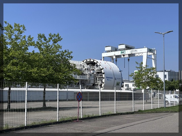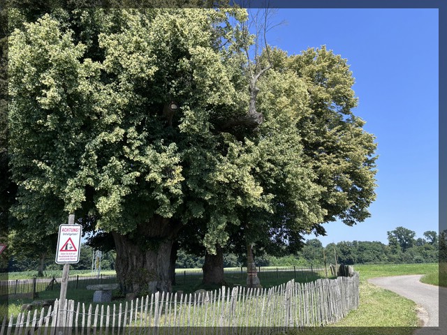 Erstmal durch die Ortschaft Rust, ein interessantes Konglomerat zwischen vereinzelten alten Gebäuden und jeder Menge Imbisse, Pensionen und Hotels. Es sind sehr viele Besucher und auch auswärtige Autos da. Der Europapark ist wohl gleichzeitig Segen und Fluch für den Ort. Wir verlassen Rust nach Norden auf einem schönen straßenbegleitenden Radweg und ganz schnell erinnert nichts mehr an den Rummel hinter uns. Nur über der Silhouette von Rust im Rückblick sind noch einige der großen Achterbahnen zu erkennen. Ab kurz vor Kappel sind wir für einige Zeit auf schönen kleinen Asphaltwegen unterwegs. Immer wieder kommen wir durch pittoreske Ortschaften mit schönen Fachwerkhäusern. In Allmannsweier kommen wir an einem Werk für große Tunnelbohrmaschinen vorbei. Vor dem Werk sieht man einige der riesigen Produkte der Firma herumstehen. Faszinierend. Hinter der Ortschaft geht es wieder auf einen straßenbegleitenden Radweg entlang der gar nicht so kleinen L75. Hier steht eine gigantische und mehrere hundert Jahre alte Linde.