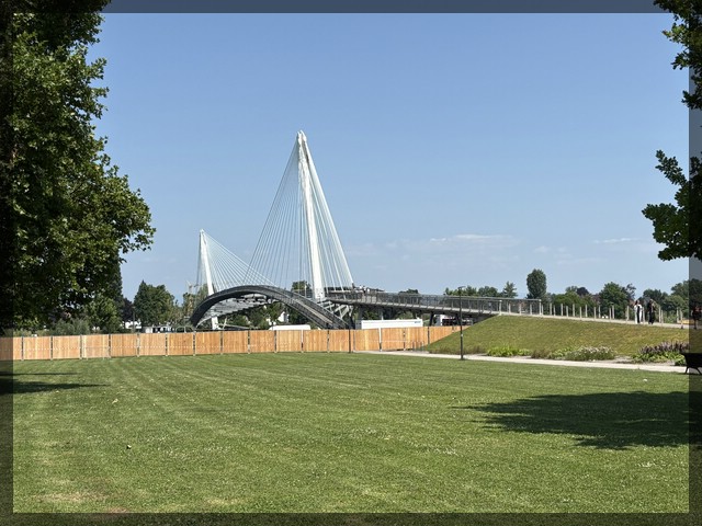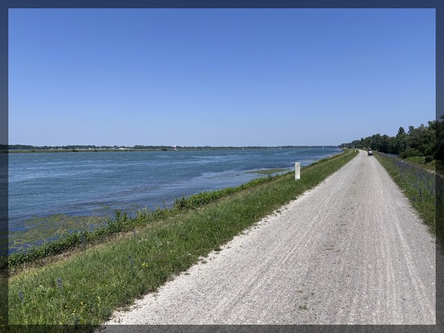 Wir kommen sehr gut voran. Die Kinder schlafen, so dass wir entscheiden, in einem Rutsch und ohne Pausen bis nach Kehl durchzufahren. In Ichenheim könnten wir nun weiter entlang der Straße nach Kehl fahren oder zum Rhein und diesen entlang weiter rollen. Wir entscheiden uns für die zweite Möglichkeit. Ab den Fluss sind wir zwar wieder auf Schotter und auch bei Gegenwind unterwegs. Dennoch bereuen wir unsere Entscheidung nicht, denn es gibt viele spannende Dinge zu sehen: jede Menge Jet-Skis, eine Schwanenfamilie mit vier Jungtieren, viele Segelboote und Frachtkähne. Langsam nähern wir uns Kehl. Ein bisschen südlich von Goldscheuer kommen wir an eine sehr enge Brücke mit Stufen an beiden Enden. Hier den Kinderanhänger drüber zu bringen ist nicht ganz einfach, wir bekommen es aber hin. Der Radweg löst sich etwas vom Rhein und wir sind im dichten Buschwerk oder Wald unterwegs. Auf einmal sind wir in Kehl, wo wir an einem alten Arm des Rheins einen schön angelegten Park mit einem Wasserspielplatz finden. Genau das richtige bei dem Wetter.