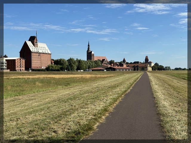 Das Frühstück auf dem Ziegenhof ist sehr gut und zum Abschied bekommen wir auch den Besitzer von Hof zu Gesicht. Ein netter Plausch korrigiert ein wenig den nicht so positiven Ersteindruck von gestern und nun erfahren wir auch, warum es aktuell kein Ziegeneis gibt: Die Eisfabrik benötigt eine Mindestmenge Milch, ehe sie mit der Produktion anfängt. Diese Mindestmenge steht aber gerade nicht zur Verfügung, da ein großer Teil der Milch vom Nachwuchs der Ziegen selber verputzt wird. Wir radeln bei wieder sehr schönem Wetter weiter nach Norden. Das Ganze immer in der Nähe des Deichs und durch eine sehr flache Landschaft. Mit wieder viel Rückenwind nähern wir uns Tangermünde.