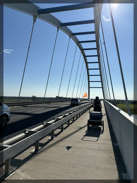Der Rückenwind schiebt uns weiter so gut vorwärts, dass wir einen möglichen Spielplatz in Neuermark-Lübars auslassen. Stattdessen wollen wir, falls es weiter gut voran geht, irgendwo noch eine längere Pause zum Eis essen einlegen. Ab Klietz geht es etwas langweiliger aber dennoch schön entlang der großen B107 bis nach Schönfeld, ein größeres und sehr properes Dorf mit hübschen alten Häusern und einem schönen Spielplatz hinter dem Feuerwehrhaus direkt am Ortsausgang. Während wir auf dem Spielplatz eine längere Pause einlegen, beginnen einige Einheimische auf dem Grundstück nebenan mit den Vorbereitungen für ein Fest, welches wohl im Laufe das Tages beginnen wird. Wir kommen zwar nicht direkt ins Gespräch, finden es aber toll, dass sofort Hilfe angeboten wird, als Alex die Schaukel ins Gesicht bekommt und weint. Auf Betonplatten rumpeln wir weiter nach Norden, vorbei an der Ortschaft Sandau, welche uns in Erinnerung bleibt durch ein Haus, in dessen Garten ein Mast mit einer Flagge vom FC Bayern Münchens steht.