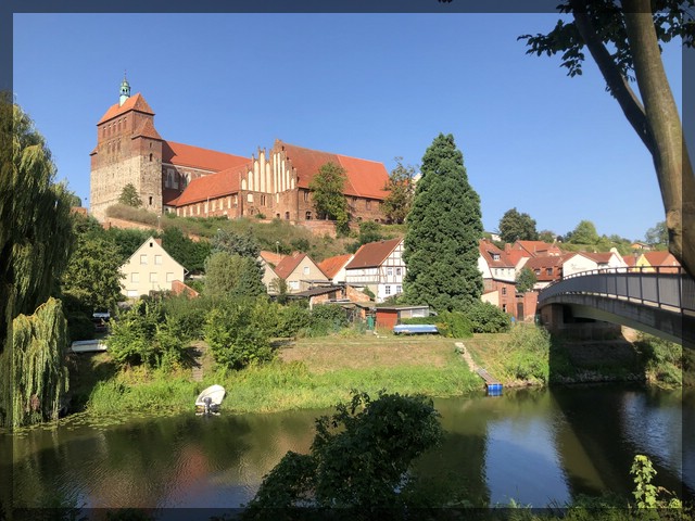 Nun ist es nicht mehr weit bis nach Havelberg, wo wir sehr früh eintreffen. Auch diese Ortschaft ist sehr hübsch, der Innenstadtbereich auf einer Insel gelegen und von alten Backsteinbauten geprägt. Die Stadt liegt fast direkt an der Mündung der Havel in die Elbe, zumindest seit es den Elbe-Havel-Verbindungskanal gibt. Der ursprüngliche Verlauf der Havel folgt nämlich noch ein bisschen unmotiviert und schüchtern für ein paar Kilometer der Elbe bis zur eigentlichen Mündung. Wir stocken wieder einmal unsere Getränkevorräte auf und nutzen dann die verfügbare Zeit für den vorher angedachten Besuch in einem innenstadtnah gelegenen Eiscafé. Dann rollen wir ein paar Meter weiter zu unserer Pension. Nach dem Einchecken gibt es einen kurzen Stadtspaziergang inklusive eines langen Besuchs auf einem genialen Spielplatz, gelegen auf der östlichen Spitze der Innenstadtinsel. Wir bummeln noch etwa durch die tolle Altstadt. Hier muss es auch einige gute Restaurants geben, allerdings hat im Moment nicht wirklich viel geöffnet. Letztendlich landen wir in einem griechischen Restaurant direkt neben der Pension. Auch wenn wir ursprünglich an eine etwas lokalere Küche gedacht hätten, schmeckt es uns sehr gut.