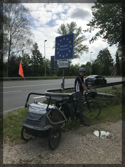 Am Dom mit seinen beiden Plätzen (Residenzplatz und Kapitelplatz) legen wir eine zweite längere Pause ein und probieren einige der hier verfügbaren sehr leckeren Eissorten aus. Danach schieben wir die Räder ein kleines Stück den Berg der bekannten Salzburger Festung hoch und kommen dabei auch an der Talstation der Festungsbahn vorbei. Wie wir es uns schon vorher gedacht hatten, scheint es auch hier nahezu unmöglich zu sein, zwei Räder samt Anhänger und Gepäck vernünftig und sicher abzustellen, also verzichten auf eine Bahnfahrt. Stattdessen wieder runter zum Fluss, vorbei an der Mozartstatue auf dem gleichnamigen Platz, ein letzter Blick zurück auf Altstadt samt Festung und weiter geht es entlang der Salzach in Richtung Südosten. An einem Supermarkt direkt am Radweg stocken wir unsere Vorräte auf und erreichen bald danach unsere Unterkunft für heute. Diese liegt etwa fünf Kilometer hinter Salzburg direkt am Radweg. Früher gab es hier eine Fähre über die Salzach und an einem Bauernhof wurden zwei, drei Tische für Leute aufgestellt, die auf die Überfahrt warteten. Mit der Zeit ist aus diesen zwei, drei Tischen ein großer Gasthof mit Restaurant geworden. Die Begrüßung ist nett, das Zimmer schön. Wir machen einen kurzen Spaziergang entlang des Flusses und verbringen dann die restliche Zeit bis zum Abendessen auf dem gasthofeigenen Spielplatz.