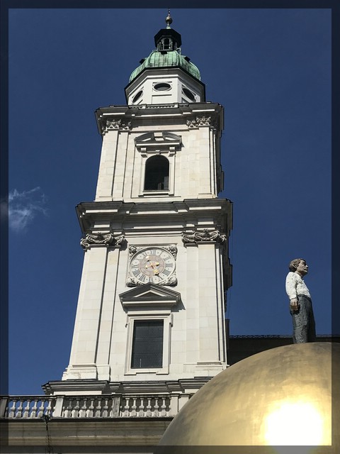 Unseren ersten Stopp legen wir am Schloss Mirabell ein. Kurz vorher sind wir recht nahe am Salzburger Bahnhof vorbeigekommen und sind ab hier auf dem Alpe Adria Radweg unterwegs, den wir bis zum Ende unserer Tour auch nicht mehr verlassen werden. Am Schloss Mirabell gibt es einen schönen Spielplatz mitsamt WC-Anlage und Wickelmöglichkeit. Nachdem unsere heutige Etappe recht kurz ist und wir viel Zeit in Salzburg verbringen wollen, bleiben wir recht lange Zeit hier, eine zünftige Brotzeit inklusive. Auf das 1606 außerhalb der damaligen Stadtmauern erbaute Schloss Mirabell werfen wir auch noch einen Blick und fahrend dann weiter in Richtung Innenstadt. Hauptsehenswürdigkeiten sind diverse auf irgendwelche Art und Weise mit Mozart verbundene Gebäude (wo wurde er geboren? Wo wohnte er?), welche wir in unsere Rundfahrt bzw. unserem Rundgang durch Salzburg natürlich auch anschauen. Rundgang deswegen, da im zentralen Bereich der Stadt aufgrund wahrer Horden an Touristen an Fahrradfahren nicht zu denken ist. Ursprünglich hatten wir hier eine zentrale Unterkunft gebucht, welche allerdings keine Abstellmöglichkeit für die Räder hatte und wir sind aufgrund der noch sehr frühen Stunde sehr froh, noch etwas weiter fahren zu können.