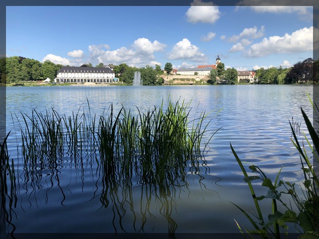 Hier wollen wir uns zunächst das Gradierwerk anschauen. Eine solche Anlage, in der Wasser über Reisigbündel geleitet und durch Verdunsten des Wassers Salz gewonnen wird, haben wir uns ja schon im Verlauf unserer Radtour nach St. Peterburg im polnischen Inowrocław angeschaut. Dessen Pendant hier in Bad Salzungen scheint uns deutlich größer und imposanter zu sein, allerdings können wir es nicht wirklich anschauen, da es aktuell komplett saniert wird und lediglich Blicke vom Bauzaun aus möglich sind. Also rollen wir weiter in die Innenstadt mit der schönen Fußgängerzone. Allzulange wollten wir hier eigentlich nicht bleiben. Da wir aber sehr früh hier sind, entscheiden wir uns, den mitten in der Stadt gelegenen Burgsee anzuschauen. Dieser See ist kreisrund und wohl durch das Einfallen eines natürlichen Hohlraums im Untergrund entstanden. Eine Promenade führt um den See herum zu den Mauerresten einer mittelalterlichen Burg, zum Kurhaus und zum Planetarium. Alles sehr grün und ruhig. Als wir den See fast komplett umrundet haben, kommen wir zu einem schönen Spielplatz mit einer sehr interessanten Eltern-Kind-Schaukel. Das alles muss natürlich ausgiebig ausprobiert werden.