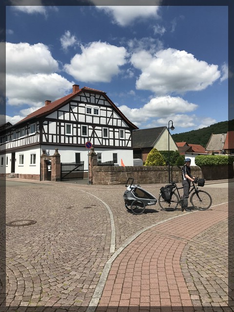 Die Ortschaft Phillipsthal, durch die wir als nächste kommen, befindet sich in Hessen, das ist das dritte Bundesland im Verlauf unserer Reise. Phillipsthal ist vor allem durch den Kalibergbau geprägt und in Erinnerung geblieben ist uns neben dem zentral gelegenen Schloss Phillipsthal von 1735 der riesige vom Bergbau stammende Abraumhügel westlich der Ortschaft. Etwas später, in Harnroda, legen wir wieder eine ausgedehnte Spielplatzpause ein. Der Spielplatz ist zwar winzig, aber Alex ist glücklich, insbesondere, da es eine Korbschaukel gibt. Die nächste größere Ortschaft – Heringen – liegt noch in Hessen, aber schon das hübsch historische Widdershausen liegt direkt an der Grenze zu Thüringen. Westlich von Widdershausen steht übrigens der nächste große Abraumhügel, dieses Exemplar hat den poetischen Namen „Monte Kali“. Wir halten kurz im Stadtzentrum an, um per Telefon dem Wirt unserer nächsten Unterkunft anzukündigen, dass wir fast da sind.