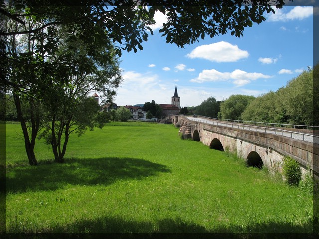 Aufgrund der Radwegsperrung verlassen wir Bad Salzungen nicht entlang der Werra, sondern zunächst mehr oder weniger neben der Hauptstraße, dann auf kleineren Straßen durch die Randgebiete. Die paar Kilometer bis Merkers – hier treffen wir wieder auf den Werratalradweg – verlaufen stetig bergauf durch eine nette Landschaft, was uns als Belohnung eine schöne Abfahrt nach Merkers hinein einbringt. Es folgt ein kurzer Anstieg und bei Dorndorf kommen wir wieder auf ein etwas größeres Sträßchen. Aus diesem rollen wir bis nach Vacha mit seiner 225 Meter langen mittelalterlichen Steinbogenbrücke. Diese Brücke befand sich unmittelbar auf der deutsch-deutschen Grenze und war somit ein Symbol für die deutsche Teilung aber später auch für die Wiedervereinigung. Direkt neben der Brücke steht das Gebäude einer ehemaligen Druckerei, durch welches die Grenze verlief. Wir schauen uns die Brücke ausgiebig an, auf eine Querung verzichten wir aber. Damit verpassen wir die wohl recht schöne Innenstadt von Vacha sowie die direkt am anderen Brückende befindliche Statue eines ostdeutschen Ampelmännchens.