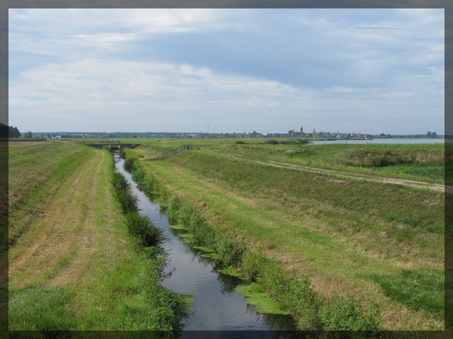 Der Tag hatte aber auch schöne Momente (und vorweg: dem Knie geht es wieder einigermaßen gut, immerhin so gut, dass wir morgen weiterfahren können). Ganz in der Früh verlassen wir die Gegend der Miliczer Seen wieder und machen dabei viele schöne Tiersichtungen – hauptsächlich Störche und Reiher, aber auch eine pelzige Raupe, die die Straße überquert. Über Dubin und Kobylin geht es nach Norden, Richtung Jarocin. Schöne Alleen wechseln sich ab mit größeren Straßen, den erwähnten schlimmen Kopfsteinpflasterstrecken und noch schlimmeren Tiefsandwegen. Die Gegend ist intensiv landwirtschaftlich genutzt (auch beim Reifenflicken werden wir von mehreren Treckern mit neugierigen Fahrern überholt). In Jarocin gibt es ein Mittagessen, danach geht es gut bergab (zum ersten Mal heute) wieder aus der Stadt. Hier sehen wir – wie schon gestern – eines der zahlreichen Autobahnneubauprojekte in Polen. Beeindruckend. Bei Pogorzelica überqueren wir auf einer winzigen Pendelfähre den Fluss Warthe. Auf mehr oder weniger guten Straßen geht es nach Strzalkowo. Um den nördlich davon gelegenen Militärflughafen geht es auf einer interessanten Betonplattenstraße (es rumpelt zwar ziemlich, aber man hört auch sehr gut, wenn sich ein Auto nähert). Bei Powidz kommen wir an den Powidzkie-See, einen von insgesamt 17 postglazialen Seen der Gegend, allesamt ein Paradies für Vogelfreunde. Nun haben wir unser Ziel fast erreicht, müssen uns nur noch ein paar hundert Meter durch tiefen Sand quälen. Falls der nette Fahrer des BMW mit Münchener Kennzeichen, der uns dabei überholt hat, das hier liest: im tiefen Sand schlingernde und rutschende Fahrräder mit hohem Geschwindigkeitsüberschuss und 10 cm Abstand zu überholen, ist gemeingefährlich.