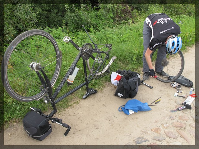 Was für ein Tag. Dass die Etappe aufgrund der kurzfristig verschobenen Übernachtung länger wird, war klar. Und rein von der Kilometeranzahl war heutige Tag immer noch OK - so etwas haben wir in Müchchen (bzw. der Umgebung von München) auch schon gemacht. Heute kamen allerdings einige hauptsächlich psychologisch unerfreuliche Nebenerscheinungen dazu: zum einen quittierte Katharinas rechtes Knie - seit Kutna Hora leicht am Zwicken - den ersten kleinen Gegenanstieg mit einem stechenden Schmerz. Zusätzliche Pausen werden eingelegt zum ibuProfen-Schlucken und Bandage anlegen (die Bandage war eigentlich für Dirks Knie gekauft worden – dem es inzwischen prächtig geht), wir fahren auch etwas langsamer und machen uns generell Sorgen, ob dies der Anfang vom Ende unserer Tour sein könnte. Etwas später, wir sind mal wieder leicht amüsiert, welche prähistorischen holprigen Kopfsteinpflastertrassen in unserem Kartenmaterial als befestigte Straße (eigentlich ja gar nicht so unkorrekt) bezeichnet werden, macht es ein lautes Zischgeräusch und Dirks Hinterrad verliert auf einmal alle Luft. Die Befürchtung, dass der Mantel aufgeschlitzt ist, bestätigt sich aber zum Glück nicht. Und noch später, wir schauen uns gerade in der Nähe von Smielow den schönen Palast an, in dem sich ein Museum zum polnischen Nationaldicher Adam Mickiewicz befindet, stürzt unser Navigerät ab. Batterien raus und wieder rein hat zur Folge, dass es beim Hochfahren hängen bleibt. Toll. Wir haben zwar Backups der Karten und der Routenvorschläge, diese lassen sich aber nicht so bequem an den Lenker schnallen. Zum Glück startet das Garmin beim zweiten Versuch wieder.