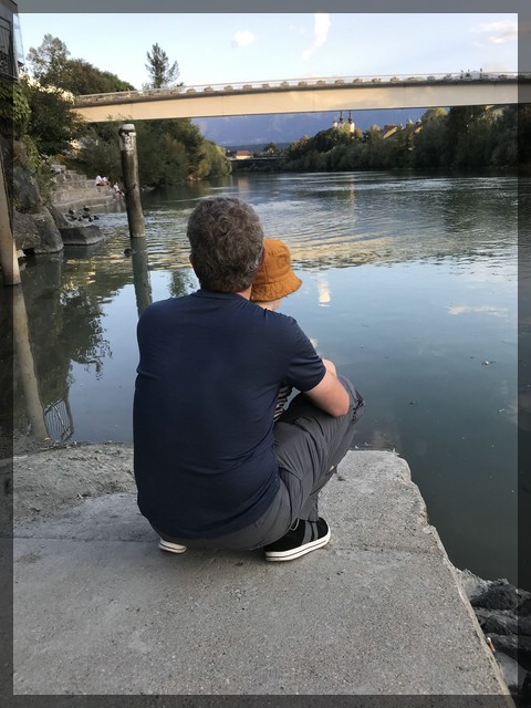 In Villach verläuft der Radweg entlang eines Grüngürtels parallel zur Drau, so dass man sehr angenehm und stressfrei bis fast in die Innenstadt rollen kann. Erst kurz vorher müssen wir einen kleinen Bogen nach links machen. Aufgrund von Bauarbeiten fällt dieser Bogen größer aus als geplant und führt uns bis zum Bahnhof. Von hier aus geht es - über eine schöne Brücke - direkt in die Fußgängerzone und zu unserem Hotel. Das Hotel befindet sich in einem historischen Palais aus dem 16. Jahrhundert und wirkt schon richtig mediterran. Wir sind halt nicht mehr weit von Italien entfernt. Wie gestern ist auch dieses Hotel voll mit anderen Radfahrern. Der Radabstellraum hier ist besonders groß und luxuriös, irgendwie sieht er aus wie ein alter Speisesaal oder so etwas. Aber auch dieser große Raum füllt sich im Lauf des Tages nahezu komplett mit Rädern. Wir machen uns frisch und brechen dann zu einem Stadtrundgang auf. Die Stadt gefällt uns sehr gut, insbesondere die Fußgängerzone mit der zentral gelegenen Pfarrkirche St. Jakob. Interessanterweise sind wir kurz vor dem Beginn eines der größten Motorradtreffens Europas hier. Überall sind schon Gäste mit ihren knatternden Gefährten unterwegs und stellen diese auf den speziell für das Treffen gekennzeichneten Motorad-Stellplätzen ab. Zum Abendessen wechseln wir auf das nördliche Drau-Ufer, wo wir im Biergarten vom historischen Brauhaus einen Platz bekommen und gut zu Abend essen. Als Nachtisch holen wir noch ein Eis und setzen uns zu dritt ans Drau-Ufer. Hier ist richtig etwas los und Alex kann Enten beobachten.