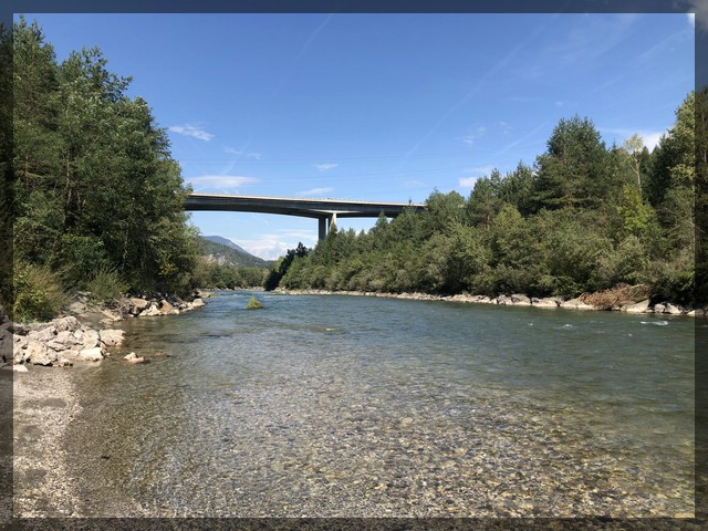 Frühstück gibt es im Innenhof des Hotels - sehr hübsch aufgrund der historischen Architektur des Gebäudes. Und gut schmecken tut es auch noch. Ehe wir bei sehr schönem Wetter Villach wieder verlassen, füllen wir noch unsere Verpflegungsvorräte wieder auf. Noch ein kurzes Stück geht es entlang der Drau, bis wir über die interessante Friedensbrücke diesen Fluss überqueren und nun entlang der deutlich kleineren Gail nach Süden rollen. Im Stadtgebiet von Villach ist dieser Wasserlauf noch langweilig kanalisiert, aber recht bald wird es interessanter. Zunächst verläuft der Radweg noch parallel zu kleineren Sträßchen, bald sind wir separat im Wald unterwegs, neben uns immer wieder die die zumindest streckenweise natürlicher verlaufende Gail. Vor uns die Berge, mit denen wir es heute und morgen zu tun bekommen werden. Das klingt alles recht urig, aber natürlich wird in einem engen Flusstal jeder verfügbare Platz gebraucht, woran uns unter anderem die hoch über uns verlaufende Brücke der Autobahn Richtung Italien erinnert.