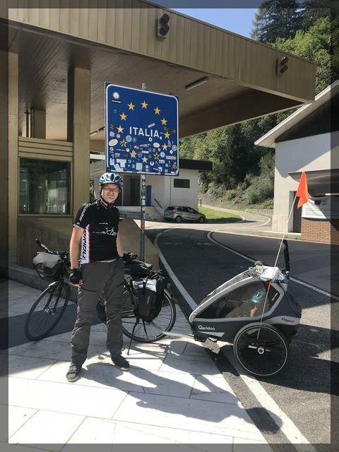 Arnoldstein, die letzte wirklich größere Ortschaft vor der Grenze nach Italien, ist keine wirkliche Schönheit und ab der Mitte der Ortschaft gibt es für eine kurze Strecke auch keinen Radweg mehr. Hier queren wir die Gailitz und die Autobahn und hier geht es nun - nach einer kurzen Abfahrt in der Ortschaft - deutlich steiler bergauf als vorher, nun aber wieder mit Radweg. Alles ist relativ, im Vergleich zur Strecke nach Bad Gastein sind diese Steigungen harmlos, aber mit dem Anhänger ist nun konzentriertes Kurbeln angesagt. Die schöne Landschaft und insbesondere die vor uns aufragenden schroffen Berge entschädigen aber für alles. Noch eine langgezogene Ortschaft - Thörl-Maglern - trennt uns nun von Italien. Noch kann man es sich nicht vorstellen, aber hinter einer Kurve wartet eine überraschend große Grenzstation auf uns. Wir wissen nicht, inwieweit die Grenzstation überhaupt noch in Betrieb ist, Fahrräder werden jedenfalls nicht kontrolliert.