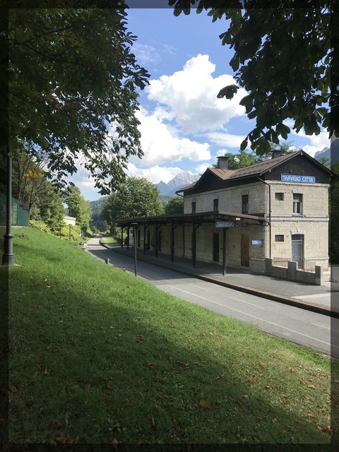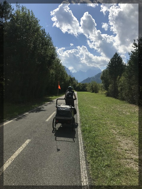 In der kleine Ortschaft Coccau geht es nochmal etwas steiler bergauf, belohnt werden wir wieder durch einen tollen Blick auf die vor uns liegenden Berge. Eine schöne Abfahrt führt uns auf einer mehr oder weniger stillgelegten Straße um einen Hügel herum und ab irgendwo hier verläuft der Radweg auf der alten Bahntrasse. In Tarvisio wird das dann schön erkennbar, denn hier kommen wir direkt am alten Bahnhof entlang. Hier gibt es einen kleinen Spielplatz, den wir erstmal für einige Zeit in Beschlag nehmen. Dirk macht sich unterdessen ohne Anhänger auf den Weg zum lokalen Supermarkt, um die Vorräte aufzufüllen. Insbesondere kühle Getränke werden benötigt. Weit haben wir es nun nicht mehr zu unserer Unterkunft, welche sich mehr oder weniger am Mittelpunkt (wenn es denn so etwas gibt) der Ortschaft befindet. Wir machen uns frisch und schauen uns dann zunächst den zentralen Bereich von Tarvisio an. Hier macht sich Alex erneut frisch, und zwar am tanzenden Brunnen auf der netten Piazza Unitá. Zunächst noch voller Respekt, stürzt er sich wenig später ganz unschüchtern in die Wasserfontänen. Angesichts des warmen Wetters ist das nichts Verwerfliches. Bevor wir unseren Spaziergang fortsetzen können, müssen wir aber dennoch noch einmal ins Hotel zurück, um die komplett durchnässten Kinderklamotten durch etwas Trockenes ersetzen.