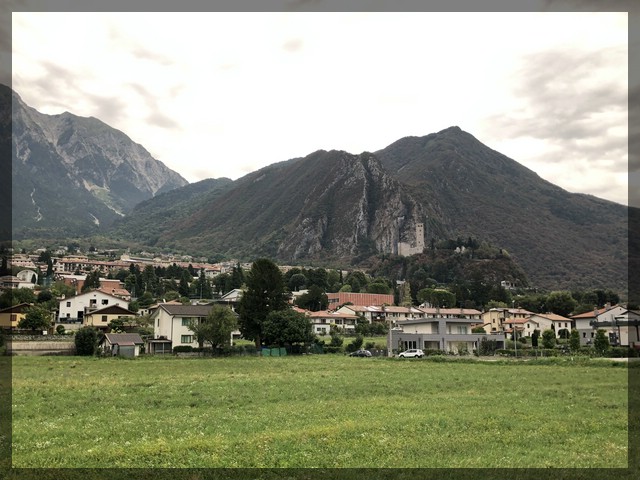 Über zahlreiche keine Ortschaften und durch hübsche Landschaften nähern wir uns Udine. Die Städtchen werden allmählich größer, das stellen wir schon in Tavagnacco fest. Am Horizont sind nun die ersten Industriegebiete und Baumärkte zu sehen und spätestens die Ortschaft Feletto Umberto gehört eindeutig zum Einzugsgebiet und Speckgürtel von Udine. Das ist ganz praktisch, denn als hier die Intensität des Regens um einige Größenordnungen zunimmt, wir uns also plötzlich in einem veritablen Unwetter befinden, finden wir zwar nicht sofort ein Restaurant oder Café zum Unterschlüpfen, aber einen netten Supermarkt mit Überdachung davor. Also flugs einen Mittagsimbiss samt Nachtisch zusammengekauft und vor dem Geschäft eine Pause gemacht und abgewartet, bis der Regen nachlässt. Wir stellen hier übrigens fest, dass der Regenradar von wetter.com, am Chiemsee noch extrem hilfreich, in Italien nichts taugt. Zum Glück kann man ähnliche Angebote auch für Italien rausgoogeln.
