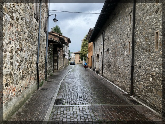 Nun fängt der Himmel langsam an, seine Schleusen zu öffnen, zunächst zum Glück aber noch in gedrosselter Form. Als wir etwa zehn Kilometer hinter Ospedaletto wieder auf unsere ursprünglich geplante Route kommen, fahren wir immer noch durch einen erträglichen Nieselregen. Die Route führt uns im weiteren Verlauf um den mit über 300 Metern sehr aus der Ebene ragenden Monte di Buja herum, mit der schönen Kirche und den Ruinen eines alten Kastells obendrauf. Auch die zahlreichen alten Ortschaften, die sich um den Berg herum aufreihen, sind sehr schön. Aktuell haben wir aber fast mehr Augen für die inzwischen im Osten hängenden dunkelgrauen Gewitterwolken, aus denen es auch drohend donnert. Wir sind sehr froh, als der Radweg im weiteren Verlauf langsam in Richtung Süden abknickt. Im weiteren Verlauf kommen noch einige der allerletzten Anstiege für diese Reise. Historische Ortschaften wurden halt sehr gerne auf Hügel gebaut.