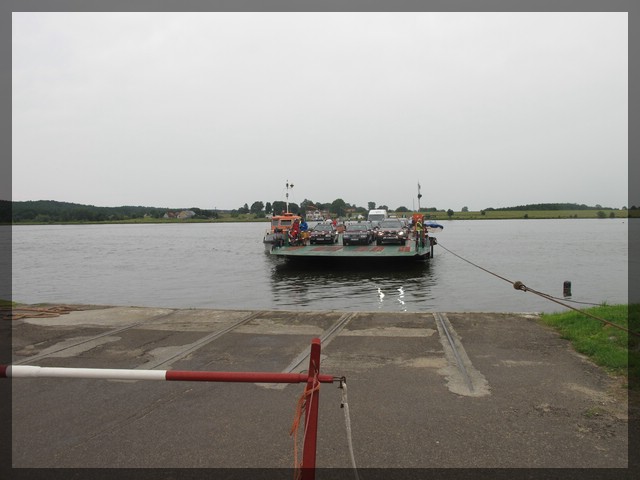 Ein paar Kilometer später kommen wir zur eigentlichen Weichsel, die auf einer Pendelfähre überquert wird. Als wir ankommen, liegt die Fähre am anderen Ufer und während wir warten, beginnt es zu regnen. Im weiteren Verlauf der Fahrt regnet es sich ein, ist aber immer noch deutlich angenehmer (da weniger stark und durchdringend – außerdem werden wir weniger von den Autos nassgespritzt) als am allerersten Tag unserer Reise. Auch der Verkehr nimmt sehr stark zu, wir werden nahezu im Sekundentakt von Autos überholt. Bei Jantar wollen wir auf die kleine Querstraße in Richtung Rybina abbiegen, doch diese ist gesperrt. Also weiter nach Stegna und von hier aus auf der 502 nach Rybina. Der Verkehr hier ist kriminell und es sind nahezu durchgehend zwar polnische Autos aber keine Einheimischen. Ist gerade Urlaubsende?