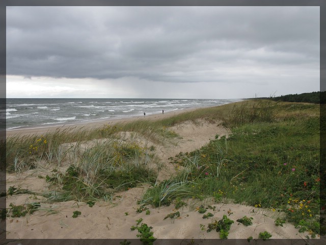 Immer wieder kommen wir auch an großen, teilweise bewachsenen Dünen vorbei. Der Radweg bleibt zunächst auf der östlichen, dem Haff zugewandten Seite der Nehrung und schwenkt dann zur Westseite. Das Meer bleibt aber hinter einem Damm verborgen. Wir halten an einer Treppe zum Überqueren dieses Damms, um einen kleinen Blick auf die heute sehr unruhige See zu werfen.