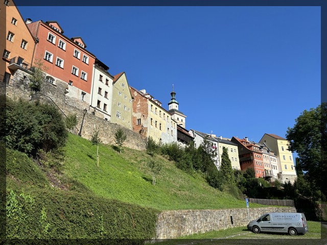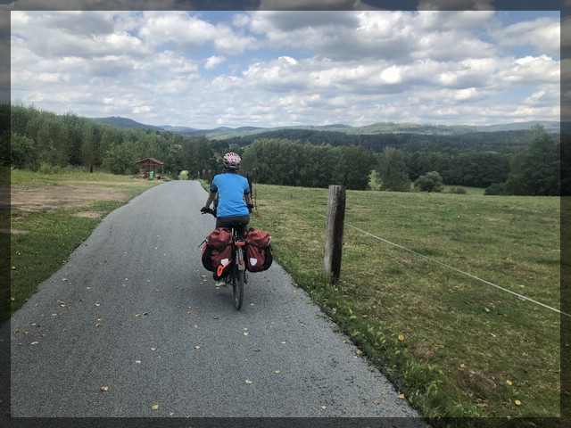 Nach dem Verlassen der Innenstadt fahren wir auf der schönen Flusspromenade ein Stück unseren Hinweg zurück, überqueren denn die Eger und fahren weiter in Richtung nördliche Ausläufer von Karlsbad bzw. des direkt anschließenden Alt-Rohlau. Hier kommen auch die ersten Anstiege, kurzzeitig über zehn Prozent. Dirk beißt die Zähne zusammen und beklagt sich nicht, denn er weiß, dass heute noch mehr kommt. Ab hier sind wir auf der so genannten Karlsroute unterwegs, die uns über die Grenzberge bis nach Sachsen bringen wird. Im ersten Teil ist die Karlsroute noch nicht wirklich spektakulär und wir rollen durch Industriegebiete und entlang Plattenbauten. Hinter Alt-Rohlau wird es aber schon viel schöner. Im kleinen Neu-Rohlau legen wir zwischen Plattenbauten eine längere Spielplatzpause ein. Danach geht es noch ein Stück durch das örtliche Gewerbegebiet und dann wird der Kinderanhänger zum ersten Mal richtig schwer: auf einem kleinen Sträßchen geht es wunderschön durch den Wald, und das über 1.5 Kilometer bergauf mit einer mittleren Steigung von über sechs Prozent, zeitweise mehr. Eine kurze Abfahrt zum Erholen und dann wieder vier Kilometer lang bergauf, aber etwas flacher als zuvor. Als Dirk nach Neudeck rollt, deutlich hinter Katharina, freut er sich sehr auf eine Pause und frische Getränke. Neudek ist eine sehr hübsche Stadt mit Geschichte, einige der hübschen Gebäude in der Innenstadt sind aber leider auch etwas heruntergekommen. Wir halten an einem Supermarkt an. Dirk kauft ein paar frischen Getränke und legt gleich vor dem Geschäft mit Trinken los. Leider sind die hiesigen Wespen genau so penetrant wie diejenigen bei uns daheim. Ein Exemplar hockt beim Trinken genau auf Dirks Nacken und mag das natürlich gar nicht. Pieks. Aua! Witzigerweise kommt auf dem weitern Verlauf der Fahrt heute noch ein zweiter Wespenstich dazu. Beide haben aber glücklicherweise keine weiteren, etwa allergischen, Folgen.