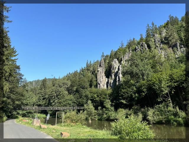 Dirk geht es etwas besser, aber nicht wirklich gut. Ein ausführliches Frühstück hilft aber ein bisschen. Dann geht es bei wieder sehr schönem Sommerwetter los, zunächst zurück zum Eger-Radweg. Dieser ist auf einmal nicht mehr ganz so schön wie gestern noch: wir sind auf einer recht rudimentären Schotterpiste im Wald unterwegs, welche uns aber immerhin durch eine wunderschöne Flusslandschaft führt. Das Tal der Eger ist hier viel schmaler als gestern, rechts und links ragen hohe Hügel auf und wir kommen an zahlreichen hohen und schroffen Kletterfelsen vorbei. Franzi ist etwas unglücklich, da es zum ersten Mal im Verlauf der Reise keine Breze als Snack für die Fahrt gibt. Daher legen wir recht früh in den Ausläufern von Karlsbad eine erste Spielplatzpause ein. Direkt an einem großen Einkaufszentrum gibt es einen schönen Spielplatz direkt am Radweg. Dieser ist aber wegen Bauarbeiten am Einkaufszentrum geschlossen, was zunächst etwas Enttäuschung bei den Kindern zur Folge hat. Wir finden aber nicht weit entfernt einen viel schöneren Spielplatz. Wir brauchen frische Verpflegung und wegen der immer noch hochsommerlichen Temperaturen vor allem Getränke. Dirk fährt daher die paar hundert Meter zum Einkaufszentrum zurück, da es hier auch einen großen Supermarkt geben soll. Also einmal rund herum, an vielen kleinen Geschäften vorbei, bis zu einer Sperrholzwand mit einem drauf gemalten Supermarkt. Es wird gerade umgebaut, Eröffnung irgendwann im kommenden Monat. Blöd. Naja, dann halt Getränke aus dem Automaten. Snacks für die Kinder findet Dirk in einem witzigen russischen bzw. ukrainischen Laden.