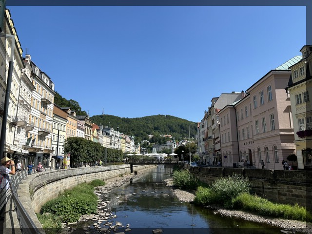 Auch wenn es nicht direkt an unserer Route liegt, wollen wir einen Abstecher in die berühmte Innenstadt von Karlsbad machen. Auf dem Weg dorthin kommen wir durch eine wunderschöne und recht neu angelegte Flusspromenade mit vielen Bänken und Spielplätzen. Dann biegen wir nach Süden ab und stoßen auf sehr viel Trubel: zunächst viele Autos und Busse und dann, in dem Teil von Karlsbad, den man von Bildern her kennt, Massen an Fußgängern. Wir bewegen uns entlang der Teplá nach Süden, vorbei an immer protziger werden Hotels und Nobelgeschäften. Hier gibt es eine „Sprudelkolonnade“ mit einem Indoor-Geysir, der bis zu zwölf Meter hoch spritzt. Das Gebäude selbst, viel hässlicher Beton, wurde in den Siebzigerjahren des letzten Jahrhunderts errichtet und passt nicht wirklich zu den Erwartungen, die wir an diesen Teil der Stadt hatten. Am Kaiserbad – hier werden die Gebäude langsam wieder etwas schlichter – drehen wir um und fahren an der anderen Seite der Teplá wieder zurück. Am sehr prunkvollen Hotel Pupp kommt kurz auch ein bisschen James Bond-Feeling auf.
