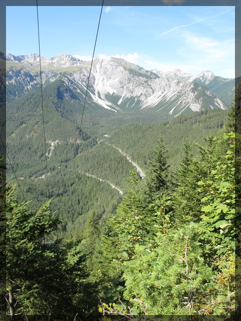Weiter geht es nach Reutte. Hier fahren wir direkt durch die Innenstadt. Diese wäre zwar im Prinzip recht hübsch, es herrscht aber extrem viel Autoverkehr inklusive Schwerlastverkehr. Es ist zwar nett, dass auf die engen Straßen Radwegsymbole gepinselt sind, zusätzlichen Platz schaffen diese Symbole leider nicht. Kurz vor dem Ortsausgang kommen wir aber wieder auf ruhigere Wege. Hier treffen wir eine größere Gruppe von jungen Leuten auf Mountainbikes, die uns in der kommenden Zeit noch häufiger über den Weg laufen bzw. fahren werden. Etwas später kommen wir mit einem der Betreuer (dieser darf - im Gegensatz zu seinen Schützlingen - ein e-Bike fahren) ins Gespräch und erfahren, dass es sich um eine Schulklasse aus Füssen handelt, die auf dem Weg zum Gardasee ist. Cool. Hinter Ehrwald geht es recht steil auf Schotter zur Ruine Ehrenberg hinauf. Hier finden wir mit unseren dünnen Straßenreifen kaum noch Halt und müssen ganz kurz schieben. Die Ruine liegt immer noch deutlich über uns, als wir an einer interessanten Mischung aus neumodischen Beschäftigungsmöglichkeiten vorbei kommen. Unter anderem gibt es eine über 400 Meter lange Hängebrücke sowie einen Schrägseilaufzug der zu dieser Brücke hinauf führt.