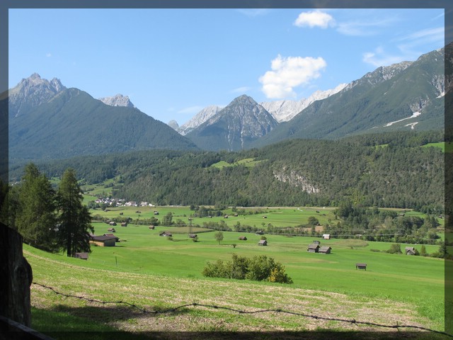 Kurz vor dem Fernsteinsee und Schloss Fernstein kommt ein etwas steileres Stück - partiell auch auf einem Stück originaler Via Claudia Augusta mit tiefen Radspuren. Dann flacht es sich ab und bald sind wir in Nassereith und wieder auf Asphalt unterwegs. In Richtung Imst geht es wieder auf einem geschotterten Waldweg. Hier sind nun auch mehr andere Radler unterwegs, viele auch elektrisch. Wir retten eine sich mitten auf dem Weg sonnende Blindschleiche - ein kurzes Streicheln reicht aus, die Echse erschrickt so sehr, dass sie eilig in den Wald und somit außer Reichweite von allen Radreifen kriecht. In Strad kehren wir zu einem verspäteten aber sehr leckeren Mittagssnack ein und rollen dann weiter nach Imst. Das letzte Stück dorthin führt wellig über schöne Bergwiesen. Die Stadt selber ist zwar hübsch wird von uns aber dennoch ohne großen Aufenthalt durchrollt. Gut bergab geht es nun ins Inntal. Wir unterqueren die Inntalautobahn und biegen dann in Richtung Westen ab. Nun fahren wir immer mehr oder weniger entlang der Autobahn recht flach nach Westen.