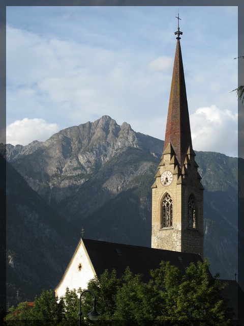 Unser Etappenziel, Landeck, ist sicherlich nicht das touristische Highlight der Gegend. Dennoch machen wir nach dem Einchecken im Hotel noch einen Spaziergang und schauen uns das Schloss Landeck an, zudem die Stadtpfarrkirche, das Richterhaus von 1520 und die Gerberbrücke, an der 1703 bayerische und französische Truppen von Tiroler Freiheitskämpfern aufgerieben wurden. Wir treffen auch auf sehr nette Tiroler Gastfreundschaft: wir fotografieren den Türgriff eines Schokoladeladens und erklären dem herauskommenden Ladenbesitzer, dass wir nichts kaufen wollen, da die Schokolade beim Radeln leider schmelzen würde. Dennoch endet die Begegnung in einem längeren und netten Gespräch über unsere Tour. Abendessen gibt es im Hotelrestaurant.