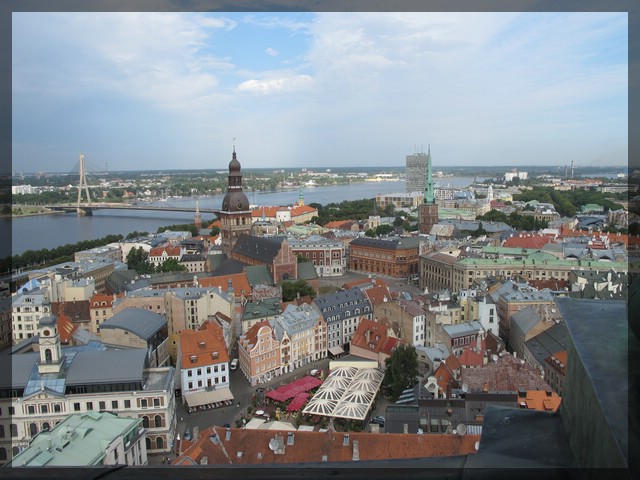 Unseren dritten Ruhetag lassen wir ruhig angehen und schlafen erstmal ein wenig länger aus als üblich. Nach dem (exzellenten) Hotelfrühstück machen wir uns auf, die Innenstadt von Riga sowie einige angrenzende Stadtteile ausgiebig zu Fuß zu erkunden. Unser erster Weg führt uns zur Petrikirche mit ihrem fast 79 Meter hohen Turm. Das Gebäude wird nicht mehr als Kirche genutzt, was den Blick vom Turm auf die Umgebung nicht weniger eindrucksvoll macht. Vor der Kirche steht - ein Geschenk der Partnerstadt Bremen - eine Bronzeskulptur der Bremer Stadtmusikanten. Ein sehr beliebtes Fotomotiv.
