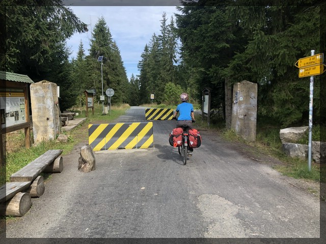 In unserer Pension gibt es für unsere Verhältnisse recht spät Frühstück. Wir verstehen, dass so ein kleiner Betrieb nicht für jeden Gast eine Extrawurst braten kann und machen wieder vor dem Frühstück alles fertig, inklusive Beladen der Räder. Nach dem Frühstück rollen wir wieder in das Dörfchen und geben dort noch ein paar übrig gebliebene tschechische Kronen im dortigen Tante-Emma-Laden aus. Im weiteren Verlauf der Strecke – immer bergauf – zeigt sich die Karlsroute von ihrer allerbesten Seite: die Landschaft ist richtig urig und wir fahren zunächst auf einem winzigen Sträßchen durch einen schönen Wald, dann durch eine offene Hochlandschaft. Es ist zwar immer noch sehr warm, aber es zeigen sich einige Wolken auf dem Himmel. Für das letzte Stück bergauf verlassen wir das Sträßchen und sind nun auf einem kleinen aber asphaltierten Weg unterwegs, wieder durch einen Wald. Kurz vor der Grenze flacht das Ganze ab und ganz oben kommen wir zu einer Lichtung, auf der sich ein uriger kleiner Imbiss befindet. Sicher eine tolle Einkehr für durstige und hungrige Radler (oder im Winter auch für Skiwanderer) aber wir haben noch das Frühstück im Magen und fahren mit etwas Bedauern vorbei.