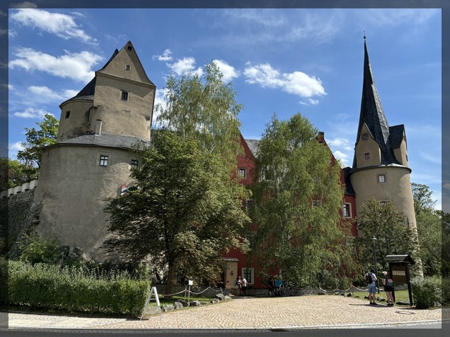 Also weiter entlang der Karlsroute und als Ersatz eine Brotzeit am Weg später. Die Karlsroute führt im Stadtgebiet von Aue über einige mit Anhänger (und eigentlich auch ohne Anhänger) fast unfahrbare Steigungen. Wir fragen uns, wer so etwas plant und weichen auf den mehr oder weniger parallel, aber auf der Straße, verlaufenden Mulderadweg aus. Verkehr herrscht sowieso fast keiner, wohl weil jeder beim Fußball ist. Daher bleiben wir auf der Straße, selbst als beide Radwege auf eine etwas ruhigere Strecke von der Straße abgeleitet werden. Kurz vor Hartenstein kommen wir auf eine kleinere Straße und fahren direkt hintereinander an gleich zwei Burgen bzw. Schlössern vorbei. In der Ortschaft Langenbach kommt ein mit Anhänger wirklich heftiger, zum Glück aber nur recht kurzer, Anstieg. Direkt hinter Langenbach biegen wir von der Straße auf einen dezidierten Radweg ab. Der Mulde-Radweg verläuft nun zwar teilweise sehr weit vom namensgebenden Fluss entfernt, das aber durch wirklich sehr schöne Landschaften. Die Qualität des Radwegs ist extrem wechselnd. In Silberstraße schließt direkt auf perfekten Asphalt ein Stück mit grobem Schotter an, welches so steil bergauf führt, dass Dirk trotz ausreichend Kraft in den Beinen ins Rutschen kommt und daher teilweise wieder schieben muss. Langsam geht es wieder bergab und langsam nähern wir uns auch den Ausläufern von Zwickau.