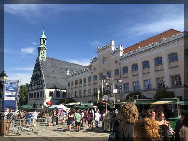 In Cainsdorf führt der Radweg direkt über den Bahnsteig vom örtlichen Bahnhof. Es gibt Gitter, welche sicherstellen sollen, dass nur Fahrräder vorbei passen. Für unsern Doppelsitzer-Anhänger ist das ziemlich eng. Beim Eingang bugsieren wir den Anhänger noch mühselig durch. Auf der anderen Seite haben wir aber keine Lust mehr und heben einfach einen Bauzaun hoch, um seitlich an der Barriere vorbei zu kommen. Hier kommen mir nun auch endlich wieder zur Mulde und in Zwickau selber ist der Mulderadweg dann ein tolles Asphaltband direkt am Fluss. Unser zentral gelegenes Hotel sollten wir im Prinzip schnell erreichen können. Allerdings findet dieses Wochenende in der gesamten Innenstadt ein großes Fest statt, so dass wir uns mit Rädern, Gepäck und Anhänger durch die Menschenmassen quetschen müssen. Nachdem die Räder verstaut sind und wir uns frisch gemacht haben, besuchen wir noch einen tollen Spielplatz direkt am zentralen Schwanenteich. Danach wollen wir Abendessen gehen und steuern ein griechisches Restaurant direkt neben dem Hotel an, bei dem wir uns auf dem Weg zum Spielplatz mündlich angemeldet haben. Leider ist nun anderes Personal anwesend, und der abgesprochene Platz auf der Terrasse steht nicht mehr zur Debatte, wir müssten uns reinsetzen. Nachdem es auch noch keinen Kinderstuhl für Franzi gibt, verabschieden wir uns und gehen zur zwar nicht preiswerten aber sehr guten Konkurrenz etwas weiter nördlich, eine urige Braukneipe. Alex isst dort den ersten Germknödel seines Lebens. Nach dem Essen hören wir noch kurz dem im Rahmen des Stadtfests stattfindenden Liveauftritt einer sächsisch-irischen Band zu, laufen die paar Meter zurück ins Hotel und fallen dann ins Bett. Das Fest geht noch ein paar Stunden weiter. Die Bässe sind gut durch die Fenster zu hören bzw. zu spüren, stören aber nicht wirklich beim Schlafen.
