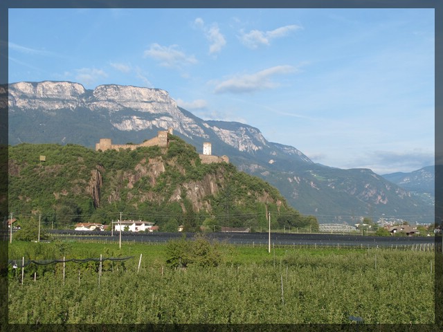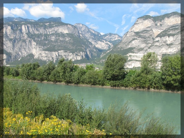 Nach dem Besuch in Margreid verlassen wir die Weinstraße und fahren zurück auf den Etschradweg, den wir nach Überqueren von Brennerautobahn und Etsch erreichen. Der Verlauf des Radwegs ist immer noch über weite Abschnitte nicht sonderlich spannend. Spannender ist da schon die Umgebung, die hohen Berge, an deren Flanken jede Menge Burgen kleben. Immer noch sind hier nicht viele andere Radler unterwegs aber interessanterweise fallen uns heute zum ersten Mal Fahrräder der großen Anbieter für Mehrtagestouren wie z.B. Eurobike auf. An der Grenze von Südtirol und Trentino löst sich der Radweg kurz vom Fluss. Hier gibt es einen netten Rastplatz und ab hier gibt es seit längerer Zeit endlich auch wieder Informationstafeln zur Via Claudia Augusta. Die Ortschaften wirken nun deutlich südländischer als es noch in Südtirol (speziell im nördlichen Teil Südtirols) der Fall war.