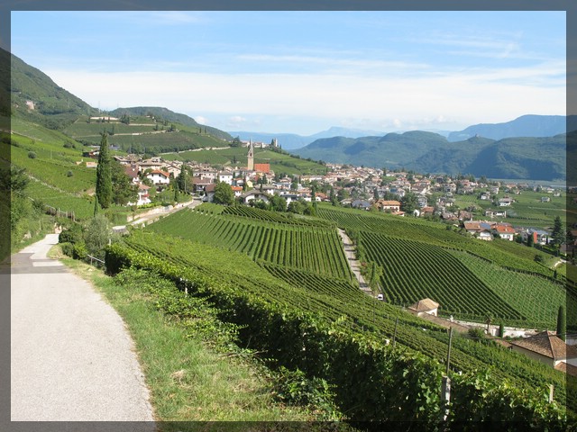Wir verlassen Bozen und nehmen nicht den schnurgeraden Radweg entlang der Etsch, sondern eine etwas spannendere Route, entlang der Südtiroler Weinstraße. Dazu fahren wir zunächst ein kurzes Stück entlang unserer Route von gestern zurück in Richtung Schloss Sigmundskron. Weiter geht es auf einer in einen Radweg umgewandelten ehemaligen Eisenbahnlinie bergauf in Richtung St. Michael. Die Blicke zurück ins Etschtal sind beeindruckend. Oben angelangt sehen wir zunächst noch nichts vom versprochenen Wein, sondern fast nur Apfelplantagen. In Mitterdorf kommen wir an einer alten Dampflok der ehemaligen Bahnlinie vorbei. Ab hier geht es ein kurzes Stück steil bergab, durch Apfelplantagen und auch durch erste Weinfelder. Wir rollen gemütlich zum schönen Kalterer See. Am Südende des Sees haben wir die Wahl, direkt zur Etsch zurückzufahren oder unsere Weintour etwas auszudehnen. Wir entscheiden uns für die zweite Alternative, und biegen in Richtung Tramin ab. Den Namen dieser Stadt hat in Gestalt des Gewürztraminers sicherlich jeder schon einmal gehört. Hier geht es noch einmal gut bergauf. Alleine die schöne Innenstadt von Tramin liegt spürbar oberhalb des Talbodens und im weiteren Verlauf der Strecke, über Rungg nach Kurtatsch zieht es noch gut an. Das führt zu tollen Blicken ins Etschtal, wo wir prominent die viel befahrene Brennerautobahn sehen. Kurtatsch gefällt uns richtig gut, doch der absolute Höhepunkt ist, nun schon wieder im Tal gelegen, die Ortschaft Margreid. Hier gibt es viele tolle alte Häuser, einen über 400 Jahre alten Weinstock und eine leicht schüchterne wuschelige Katze, die sich lieber im Sand wälzt, als mit uns zu kuscheln.