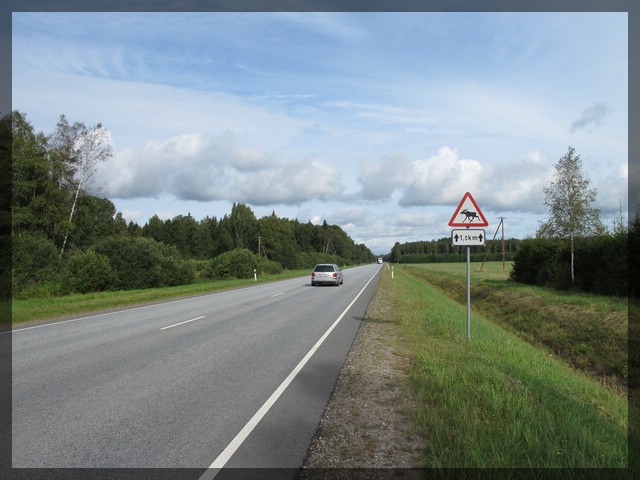 Spontan erarbeiten wir einen Kompromiss zwischen den beiden Routenalternativen, wodurch sich der Tag in zwei grundlegend unterschiedliche Teile aufspaltet: die ersten 88 km, bis zur winzigen Ortschaft Kernu, fahren wir auf der Schnellstraße. Zu Beginn hält sich der Verkehr noch sehr in Grenzen, was wir darauf zurückführen, dass Sonntag ist. Es lag aber wohl eher an der Uhrzeit, denn im Verlauf der Stunden nimmt der Verkehr doch sehr zu. Es sind auch viele LKW unterwegs - aber der Seitenstreifen hat eine annehmbare Breite, fast alle Aufofahrer sind sehr höflich und wir fühlen uns fast immer sicher. Die Landschaft wechselt zwischen landwirtschaftlich genutzten Flächen und skandinavisch wirkendem Nadelwald. Wir kommen gut voran, haben teilweise auch guten Rückenwind. Bei Kernu wollen wir eine Pause an der dortigen Raststätte einlegen. Leider hat diese momentan aber Sommerferien, so dass wir uns mit unseren eigenen Vorräten stärken.