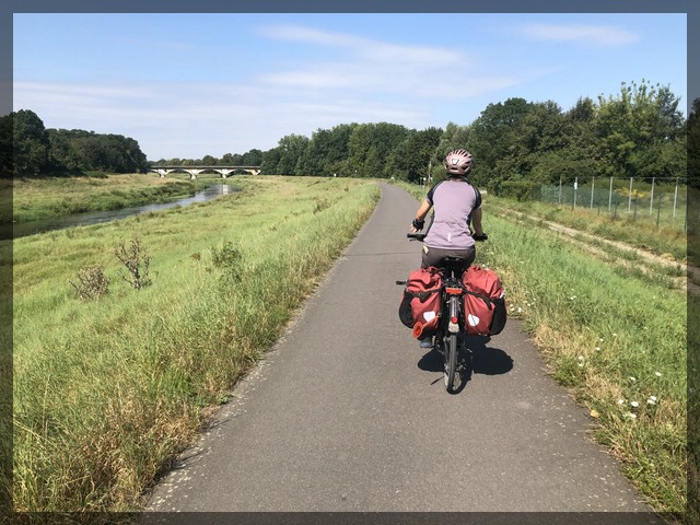 Durch das Rosental, eine große und historische Parkanlage - schon August der Starke wollte an dieser Stelle ein Lustschloss errichten - verlassen wir die Innenstadt von Leipzig und stoßen recht bald auf den Elster-Radweg. Dieser führt über viele Kilometer als perfekt asphaltiertes Band nicht etwa entlang der Elster, sondern entlang der Neuen Luppe. Dieser Fluss ist hier sehr kultiviert, fließt durch eine breite Wiese, links und rechts eingefasst von Deichen, auf denen der Radweg verläuft. Erst südlich vom Leipziger Flughafen geht es ein Stück auf Schotter durch den Wald. Warum der Radweg hier den Fluss verlässt ist uns nicht ganz klar, denn nach dem kurzen Abstecher kommt das Asphaltband entlang des Flusses wieder, der hier nun aber Elster heißt. Da wir sehr schnell vorankommen, entscheiden wir uns, auf die hier mögliche Spielplatzpause zu verzichten, um stattdessen in Halle mehr Zeit dafür zu haben. So gibt es nur eine kurze Pause, während der Franzi eine frische Windel bekommt. Es geht flott weiter und überraschend schnell erreichen wir die ersten Ausläufer von Halle. Ab hier geht es nicht mehr wirklich gut voran. Gründe dafür sind insbesondere mit Kinderanhänger blöd zu umfahrende Baustellen, Abschnitte ohne Radweg aber mit extrem groben Kopfstein, viele Ampeln, allgemein viel Verkehr und das Ganze auch noch gewürzt mit einigen kleinen Hügeln. Wir sind froh, als wir die moderne Südstadt, errichtet etwa ab den 50er-Jahren des 20ten Jahrhunderts, erreichen. Hier gibt es eine tipptopp angelegte Infrastruktur, samt Trambahn und perfektem Radweg, auf dem wir problemlos bis in die Innenstadt rollen können.