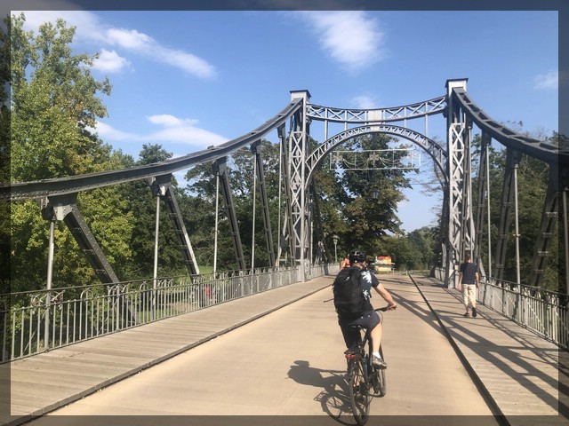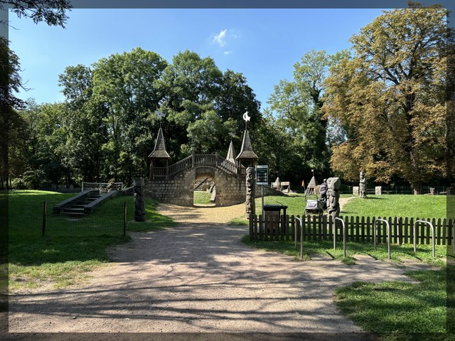 Wir sind so früh da, dass wir einen Abstecher auf die Peißnitzinsel machen können, etwa zwei Kilometer weiter nach Norden. Auf dieser Insel befindet sich ein innenstadtnahes Naherholungsgebiet mit Sportplätzen, Spielplätzen und Restaurants. Wir fahren zum Baschkirischen Spielplatz. Dieser Spielplatz ist toll im Stil des Mittelalters oder von Fantasybüchern gestaltet, Drachen inklusive und hat seinen Namen, weil er von Studenten aus Ufa in Baschkiristan gestaltet wurde. Wir verbringen viel Zeit hier und kommen dabei auch mit einer netten Familie aus der Gegend ins Gespräch. Sie sind auch mit dem Rad hier und können Tipps für unsere Weiterfahrt geben. Am späten Nachmittag rollen wir zurück in die Innenstadt. Der Fahrradraum in Hotel befindet sich witzigerweise nicht im Keller, sondern nimmt in einer ganz normalen Zimmerflucht den Platz ein, an der sich auch ein Zimmer befinden könnte. Unser Zimmer ist netterweise im selben Stockwerk und nicht weit entfernt. am Abend gibt es noch einen kleinen Bummel durch die Altstadt, vorbei am Hallmarkt und der dahinterstehenden Marktkirche unserer Lieben Frauen. In einer der vielen schönen Nebenstraßen finden wir einen urigen Biergarten, wo wir gut zu Abend essen.
