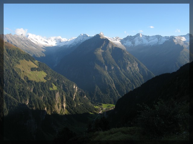 Berge oberhalb von Ginzling. Hinten zu sehen der Große Löffler, der Große Mörchner und die Zsigmondyspitze